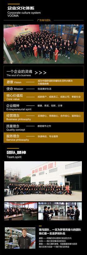 廣東瑞馬以“致力于成為中國(guó)舒適的采暖和生活熱水解決方案提供商”為企業(yè)愿景,秉承“健康、務(wù)實(shí)、創(chuàng)新、分享”的企業(yè)精神,堅(jiān)持“成就客戶、成就員工、成就公司、奉獻(xiàn)社會(huì)”的核心價(jià)值觀,以“買得舒心、用得放心、合作安心、服務(wù)貼心”的經(jīng)營(yíng)理念,為客戶創(chuàng)造美好生活!